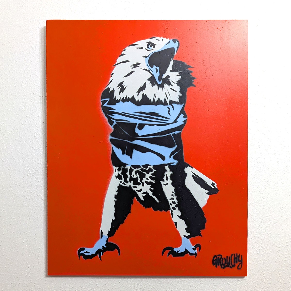 Aerosol Acrylic on 19×24 in. plywood. This painting features a bald eagle in a straitjacket. Painting comes with wire picture hanging hardware installed. Note: Although these paintings use stencils, each creation will have unique elements and the actual piece may have slight visual differences from this image.