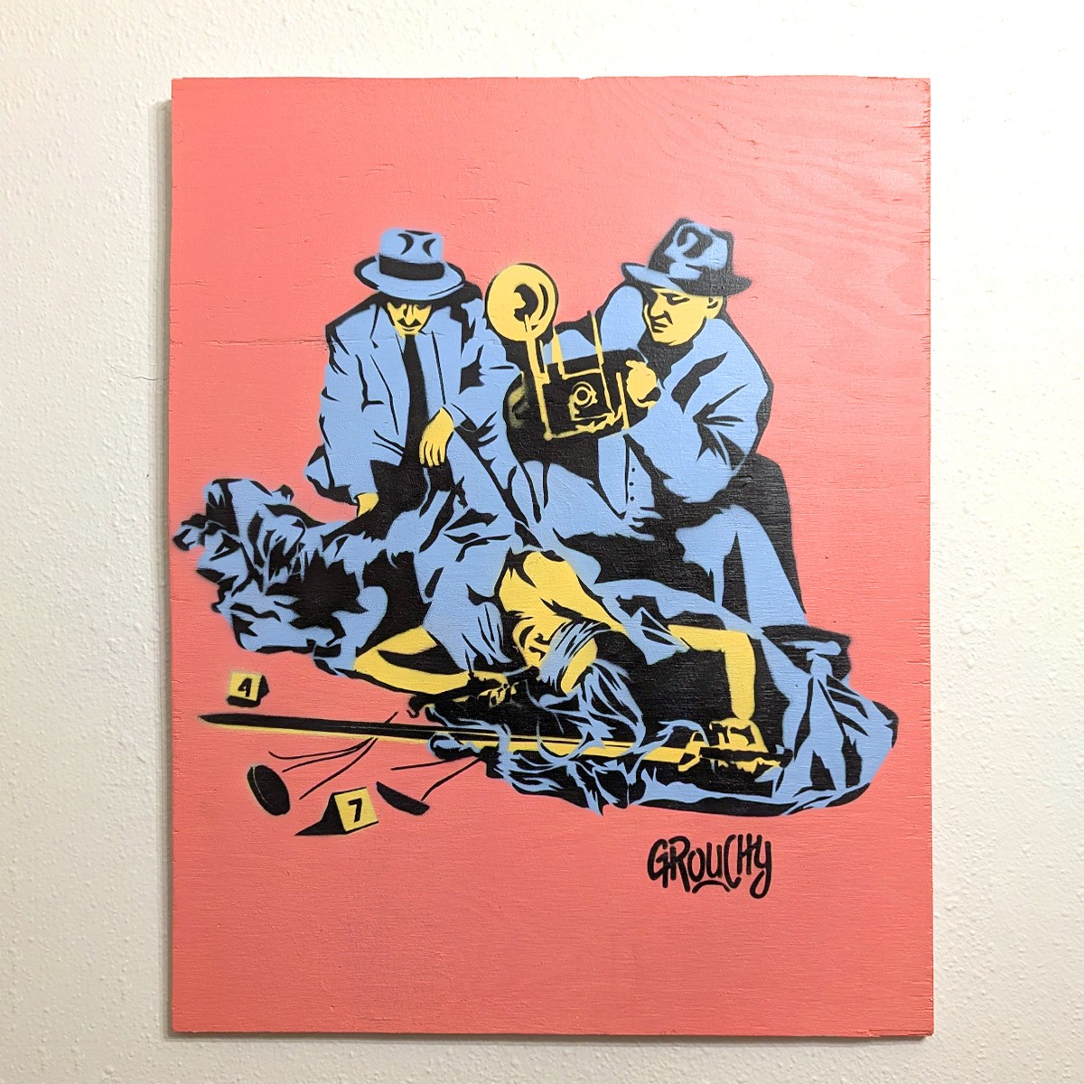 Aerosol Acrylic on 19×24 in. plywood. This painting features the murder scene of Lady Justice.