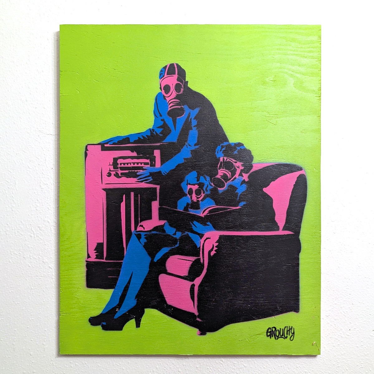 Aerosol Acrylic on 19×24 in. plywood. This painting features a family listening to a large radio while wearing gas masks.
