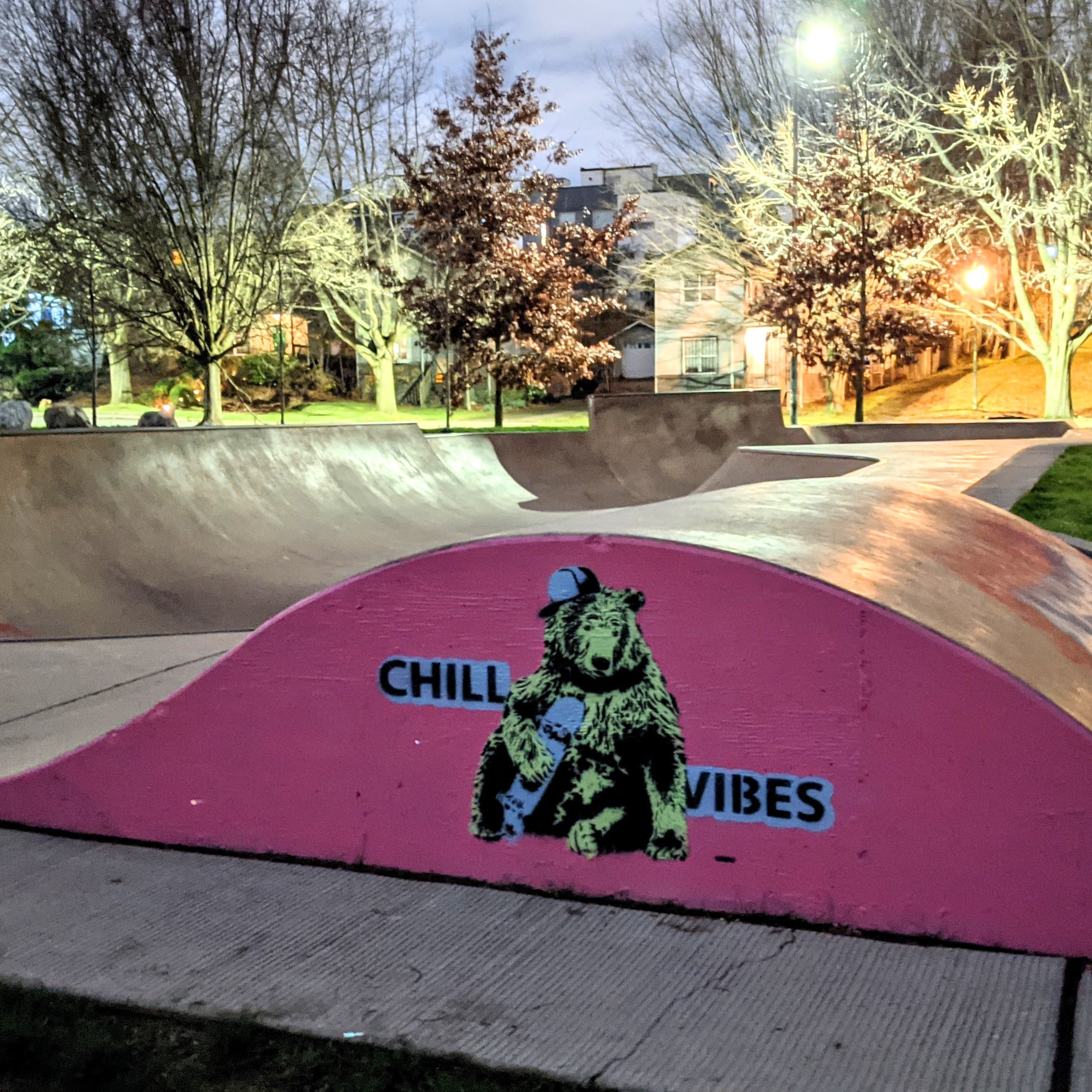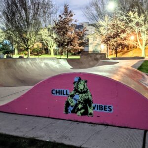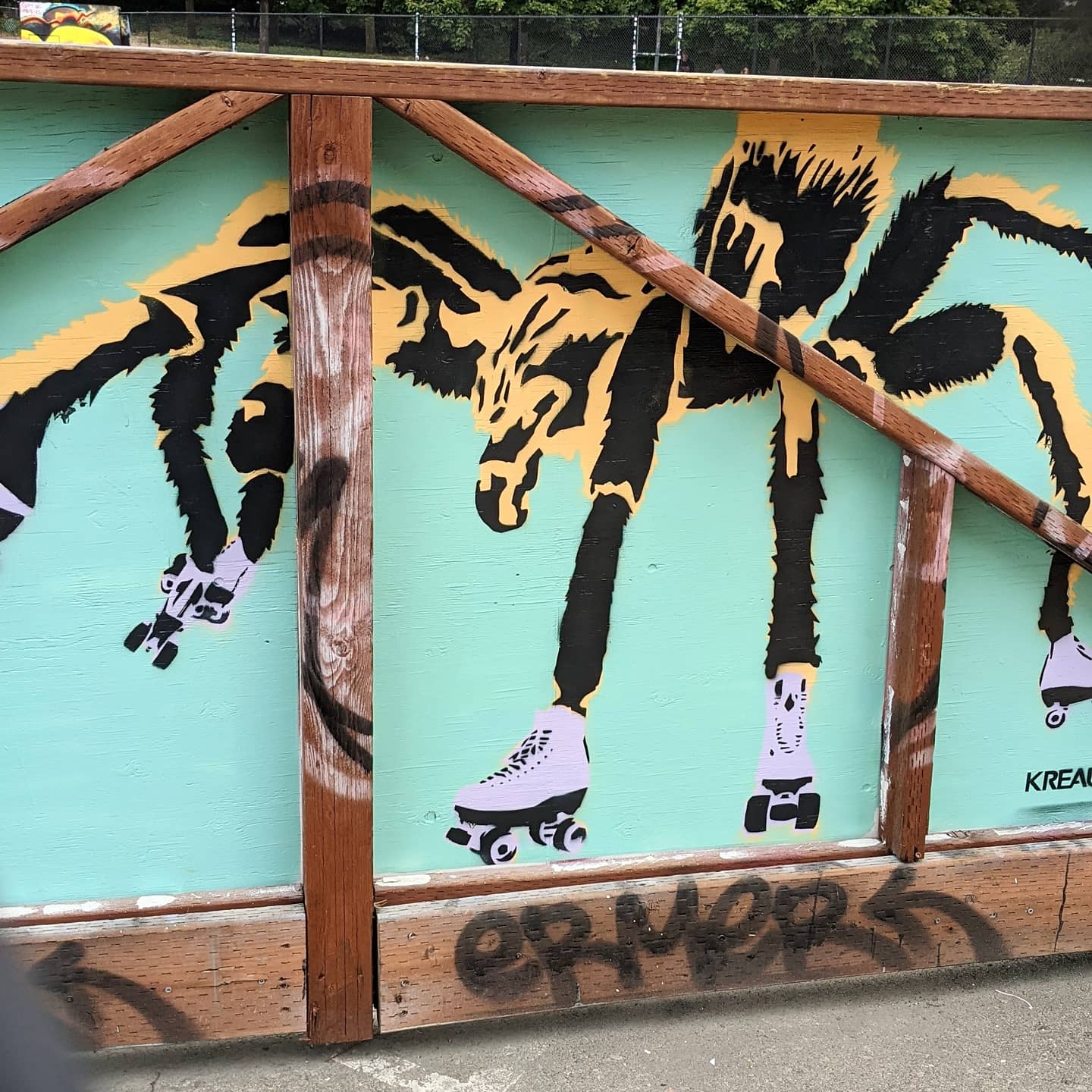 Judkins Park, skatepark, Seattle, WA. I was inspired by the community of skateboarders and rollerskaters so I put up two pieces. The Tarantula was tricky, because each panel of the wall was sprayed as an independent stencil, rather than going over the studs. Just a little detail.