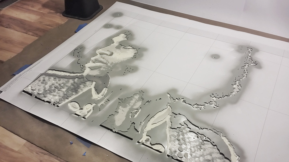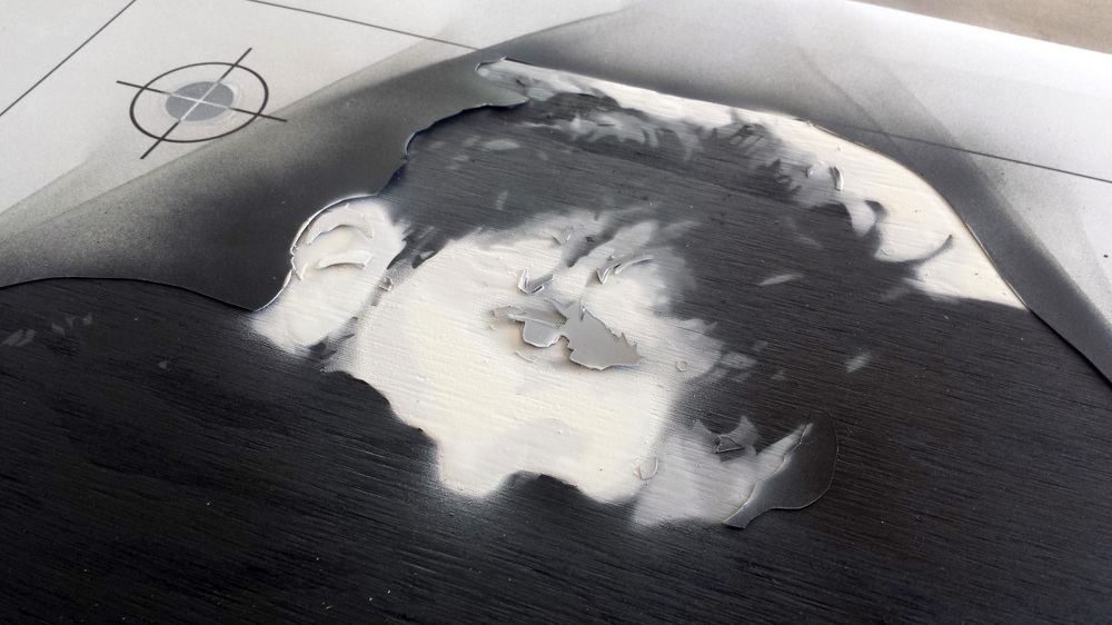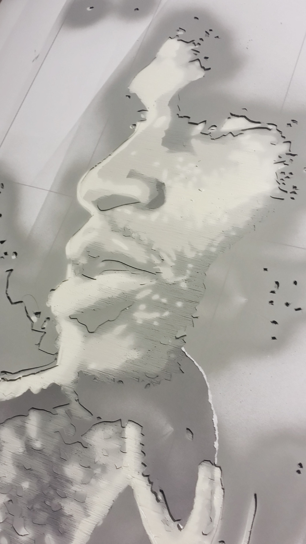 A series of multilayer stencils, spray acrylic, on stained plywood. This series focused on portraits and capturing realism in a reduced palette of 7 – 9 tones of grey.