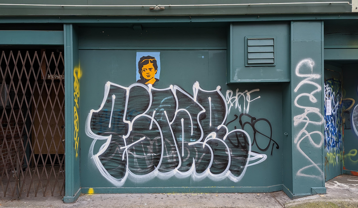 This piece lasted quite a while but eventually started getting covered up. Each time a tag appeared, the building owner started to carefully paint around the mural, even tho it was non-commissioned work. They did this on my next piece as well, which led to a short-lived, but kind of funny conspiracy theory that I was either the building owner, or secretly a land developer. Naw.
